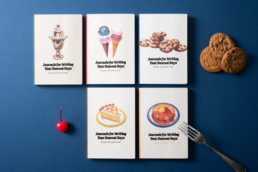 パンケーキやレモンパイ、サンデー、クッキー、アイスクリームといったスイーツを大胆に描きました。紙製の風合いとクラシカルな書体が重なり、まるで古い広告を思わせる仕上がり。日常に甘いアクセントを添えてくれます。