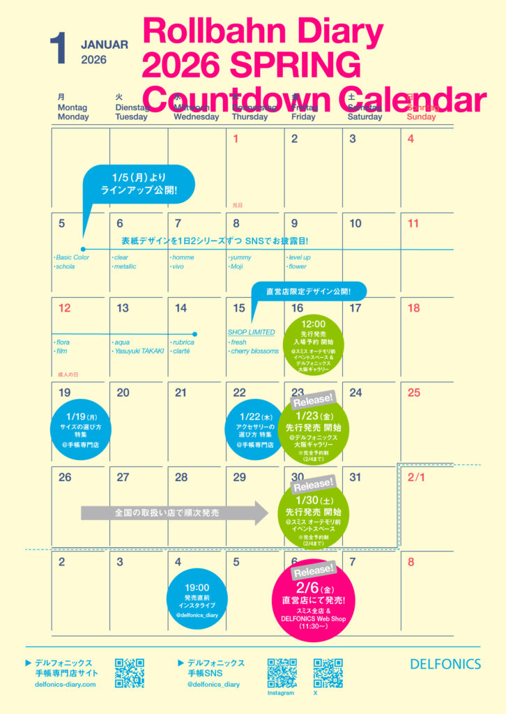 3月始まりのダイアリーに関する情報は、こちらの手帳専門店サイトと、手帳SNS 【X @delfonics_diary】【Instagram @delfonics_diary】でお知らせしていきます。ぜひチェックしてみてください。