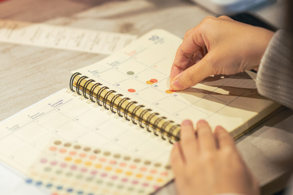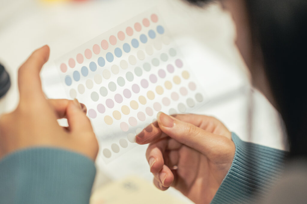 記録の最後のステップは、感情を色で表すこと。メモページに書いたモーメント・ジャーナルを見返しながら、感情を表すカラーシールをマンスリーページに貼っていきます。記録した日の目印になるだけでなく、直感的にその月の感情の波を振り返ることができるステップ。複数枚を重ねて貼ったり、貼り方を工夫したりしながら、記録した瞬間を振り返りました。