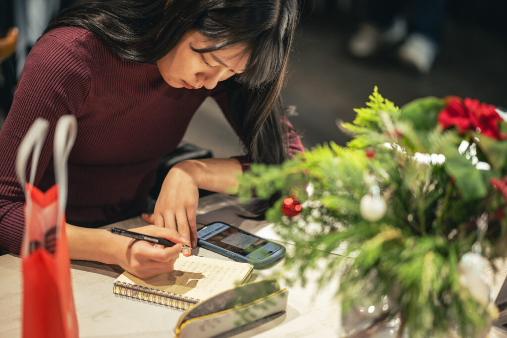 会場には集中した空気が流れ、それぞれのペースで黙々と書き進める姿が見られました。写真やスクリーンショットに加え、SNSで保存した画像や動画を題材にしている人も。どんな些細なことでも、一言書き始めてみると、意外と言葉は出てくるものです。普段は目を向けない小さな心の動きや、最近の自分の調子を振り返る時間にもなりました。