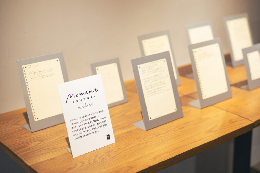 そんな初心者のみなさんにもより具体的なイメージを持っていただければと、今回は新たに展示も実施。内容は、デルフォニックスのスタッフが書いた18名のリアルなモーメント・ジャーナル。シンプルな記録方法ですが、書き手によって全く異なる書き方や内容になるのが面白さ。サイズも、M、L、A5とさまざまで、絵を描いたり何かを貼ったり、余白の取り方一つ見ても個性が現れています。