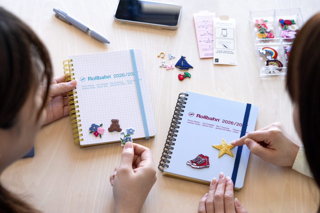 書きたい内容や、手に取った時の印象を思い浮かべながら、お好きな1冊と表紙を彩るワッペン2点を選んでいただけます。自分らしい色や好きなもの、今の気分を表すアイテムを組み合わせ、愛着の湧くダイアリーで記録をスタートしましょう。