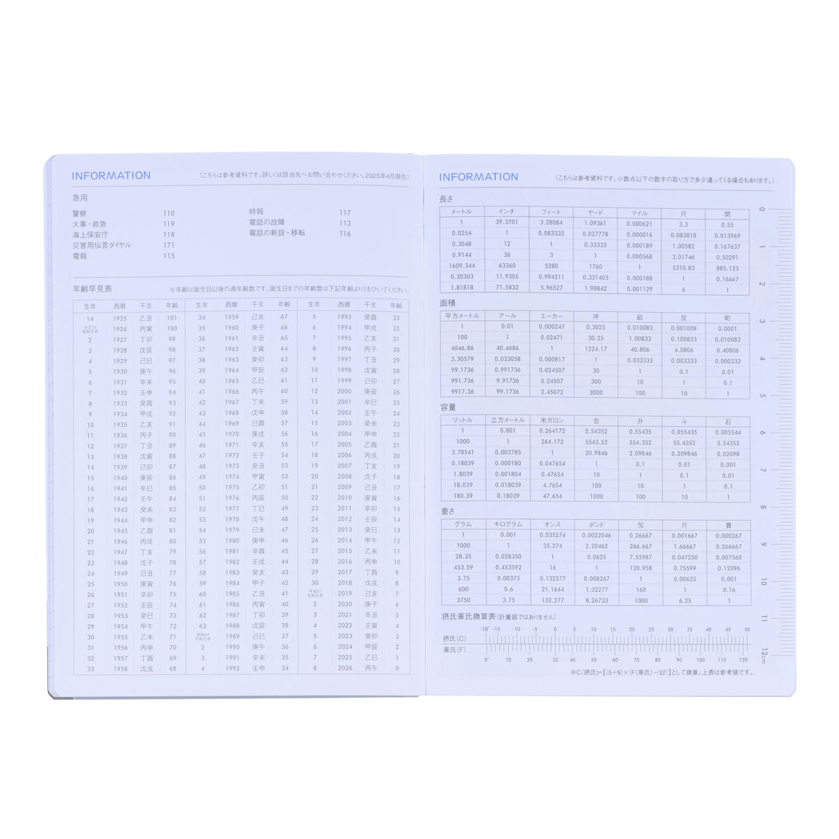 中面は月別インデックスの付いた見開き1カ月のマンスリーと、見開き1週間のウィークリーで構成。ウィークリーページは、左ページが週間スケジュール、右ページが方眼メモになったホリゾンタルタイプ。1月始まりのリフィルは、モダンで幾何学的な印象を受ける書体や、スタイリッシュなブルーの印字が特徴です。マンスリーページは、6段のカレンダーで、6週になる月の最終週も予定がしっかり書き込めます。ウィークリーページは、予定とタスク管理を見開きの左ページに集約できます。1日の左半分を日付入りのフリースペース、右半分を罫線メモスペースに分け、To Doや文章が記入しやすくなっています。見開きの右ページメモは自由度の高い方眼。予定と記録が見渡せて、より書き込みがしやすいレイアウトです。巻末には自由に使える方眼メモも20ページあります。1本のスピン(しおり紐)付きで、ページを開く目印として役立ちます。祝日や、「大安」などの六曜、夏至・冬至といった二十四節気も記載された、見やすく機能的なデザインです。