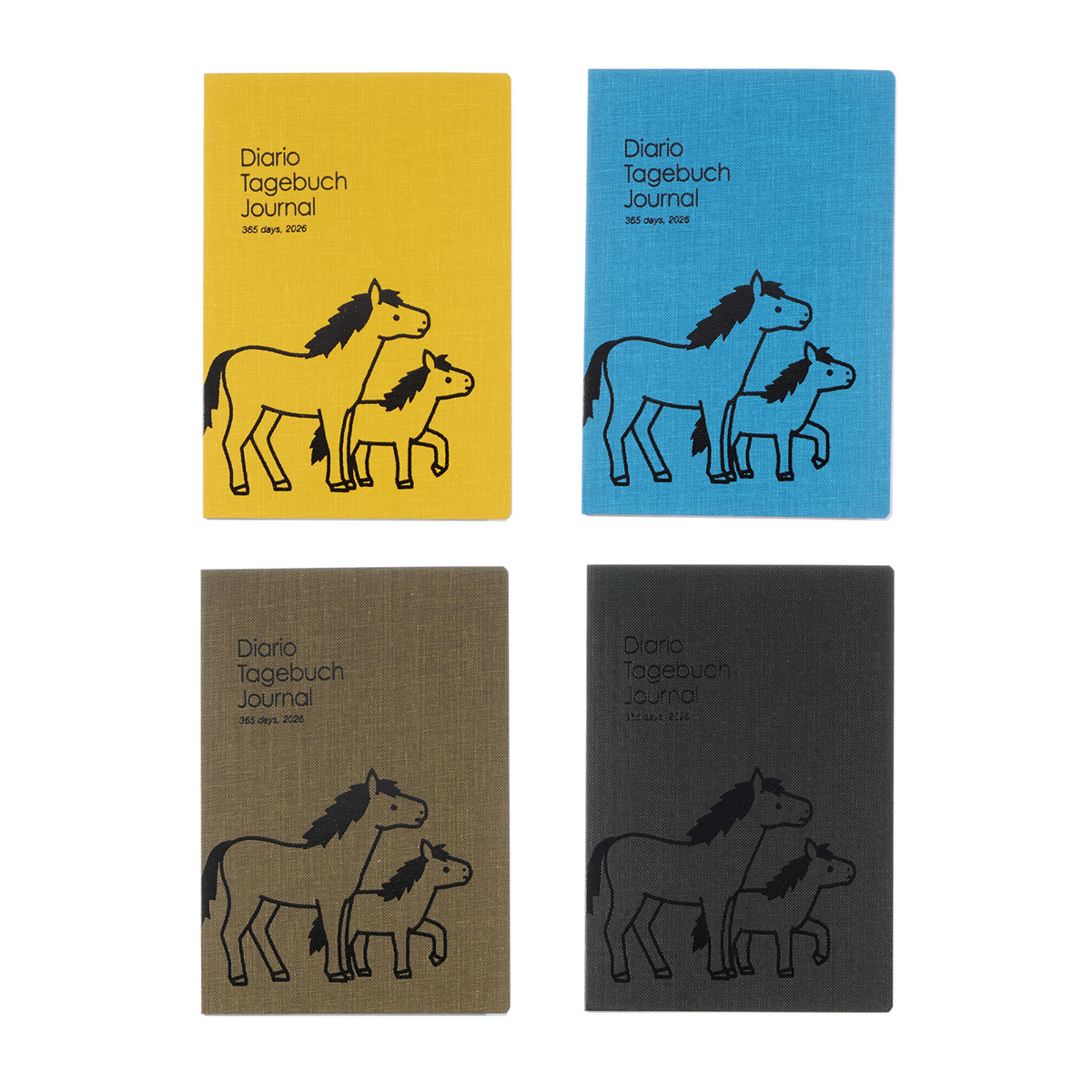 カラーは、イエロー、ブルー、ブラウン、ブラックの全4色。シックな色合いから明るいトーンまでそろい、お好みのスタイルに合わせて選べます。生地のような風合いを持つ表紙には、寄り添うウマの親子を箔押しで配し、イラストに合わせた丸みのあるフォントがポイントです。
