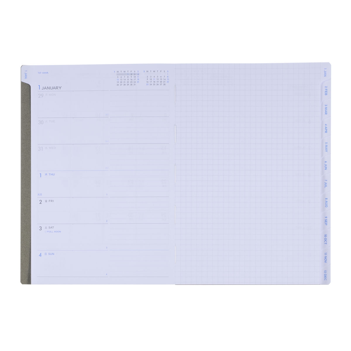 中面は月別インデックスの付いた見開き1カ月のマンスリーと、見開き1週間のウィークリーで構成。ウィークリーページは、左ページが週間スケジュール、右ページが方眼メモになったホリゾンタルタイプ。1月始まりのリフィルは、モダンで幾何学的な印象を受ける書体や、スタイリッシュなブルーの印字が特徴です。マンスリーページは、6段のカレンダーで、6週になる月の最終週も予定がしっかり書き込めます。ウィークリーページは、予定とタスク管理を見開きの左ページに集約できます。1日の左半分を日付入りのフリースペース、右半分を罫線メモスペースに分け、 To Doや文章が記入しやすくなっています。見開きの右ページメモは自由度の高い方眼。予定と記録が見渡せて、より書き込みがしやすいレイアウトです。巻末には自由に使える方眼メモも20ページあります。1本のスピン(しおり紐)付きで、ページを開く目印として役立ちます。祝日や、「大安」などの六曜、夏至・冬至といった二十四節気も記載された、見やすく機能的なデザインです。