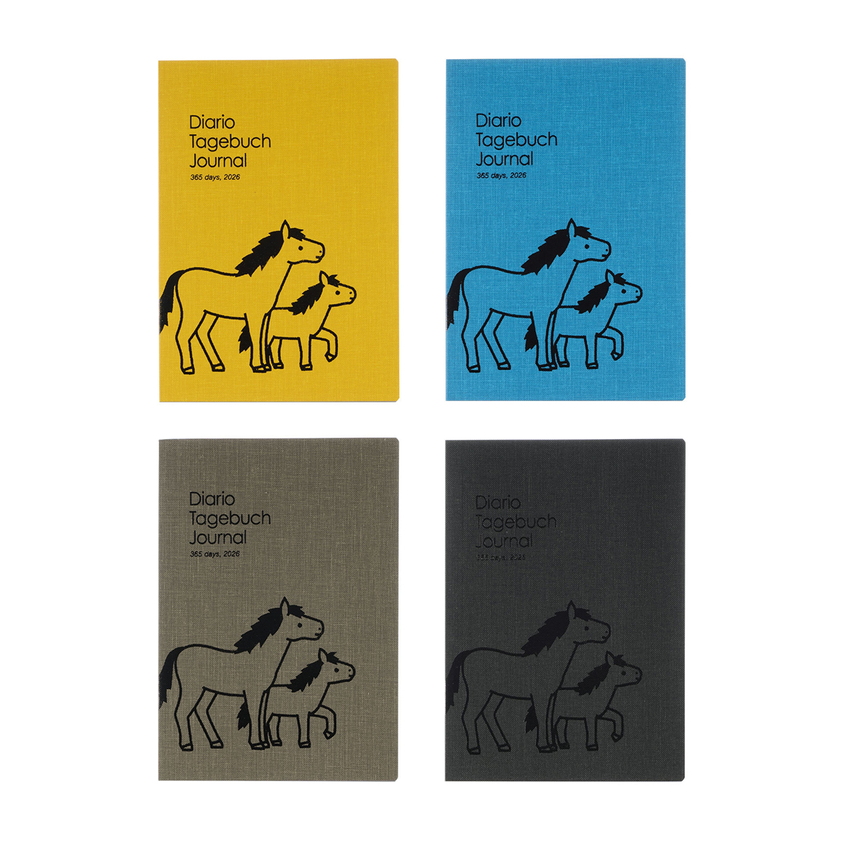 カラーは、イエロー、ブルー、ブラウン、ブラックの全4色。シックな色合いから明るいトーンまで揃い、お好みのスタイルに合わせて選べます。生地のような風合いを持つ表紙には、寄り添うウマの親子を箔押しで配し、イラストに合わせた丸みのあるフォントがポイントです。