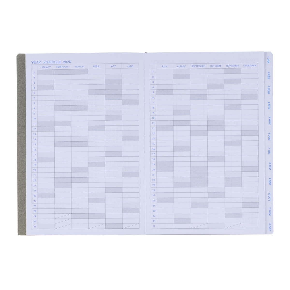 ダイアリーで人気のB6サイズで、中面は、月間の見開きページのみで構成された、スリムなマンスリータイプです。月別インデックスの付いた、見開き1カ月のカレンダーと、見開きの方眼メモを交互に配置。マンスリーページは、6段のカレンダーで、6週になる月の最終週も予定がしっかり書き込めます。巻末には、自由に使える方眼メモが10ページあります。ポニーのマンスリータイプはB6のほかに、A6サイズがラインアップ。ほかに、ウィークリー・ホリゾンタルタイプのA6、B6もあります。2026年らしい1冊を探している方におすすめです。