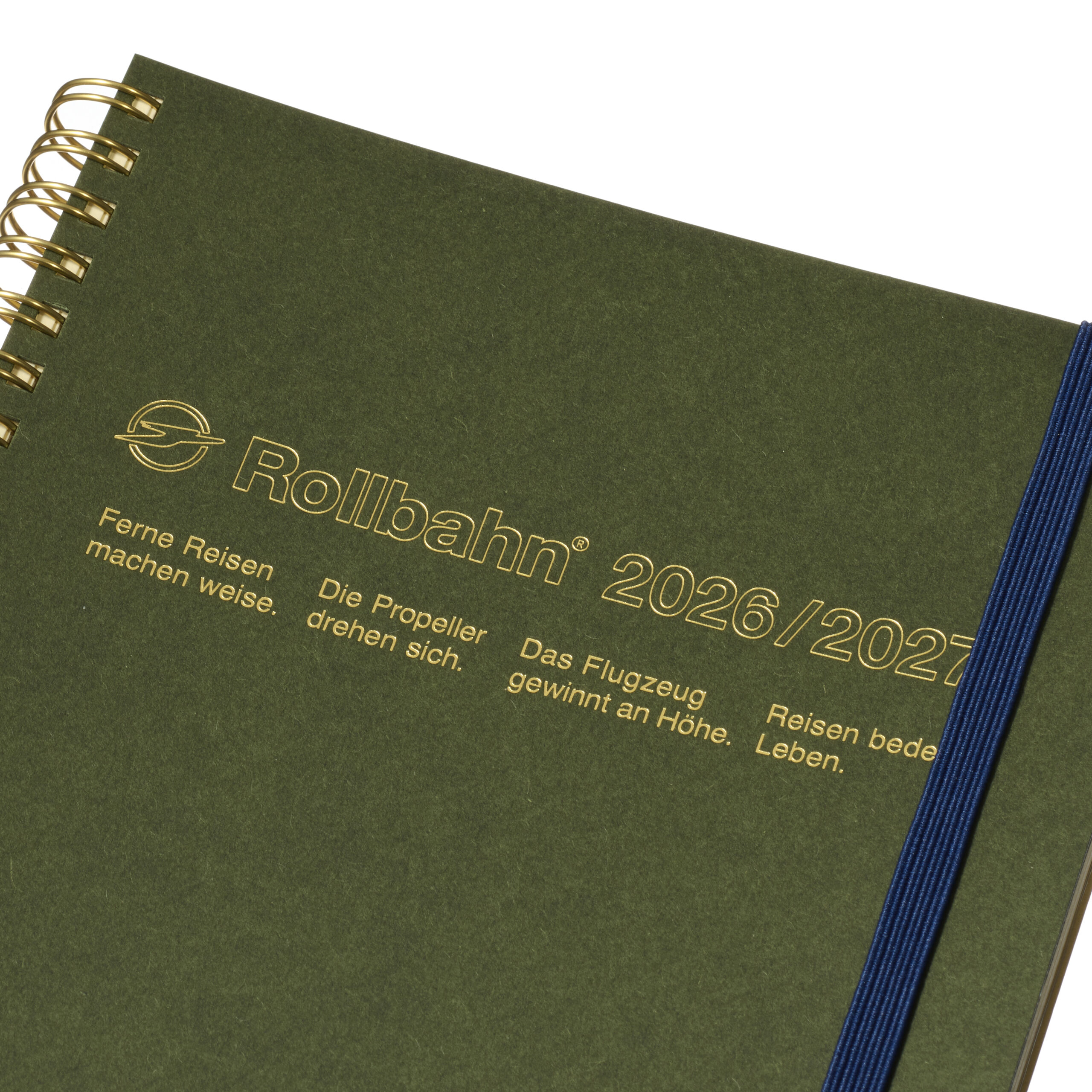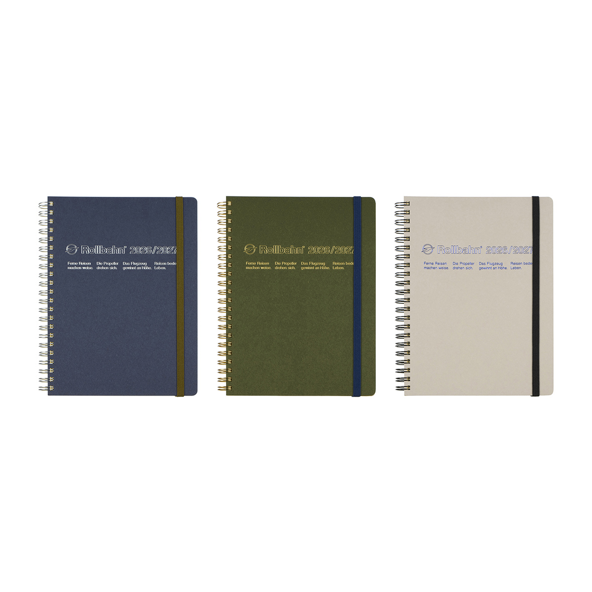 カラーは、ダークブルー、オリーブ、ライトグレーの全3色。ゴムバンドの色は、ダークブルーはグリーン、オリーブはダークブルー、ライトグレーはブラックを合わせています。型抜きのロゴは、ダークブルーがシルバー箔、オリーブがゴールド箔、ライトグレーがメタリックなブルー。落ち着いた配色にきらりと映える箔の組み合わせがモダンな佇まいです。