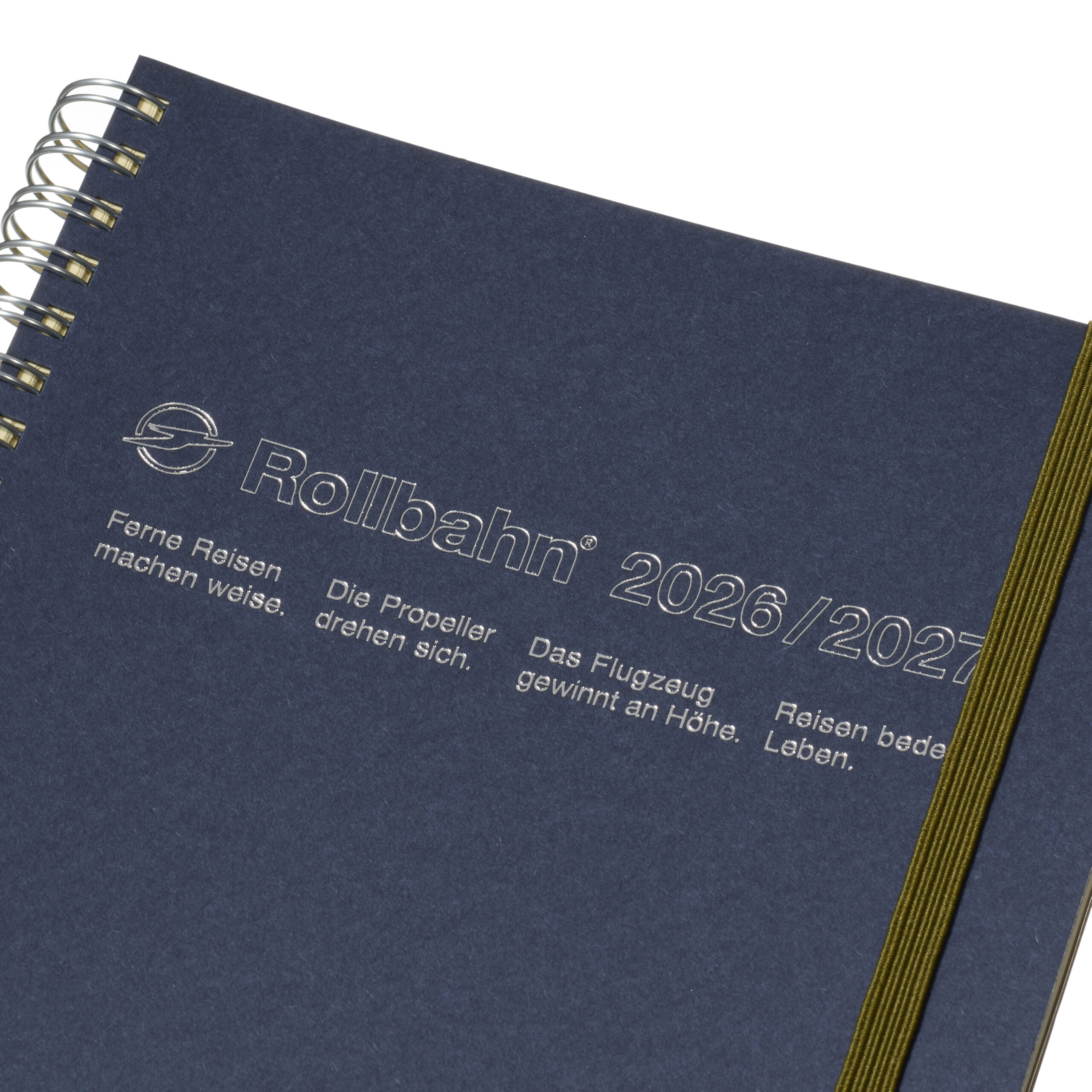 カラーは、ダークブルー、オリーブ、ライトグレーの全3色。ゴムバンドの色は、ダークブルーはグリーン、オリーブはダークブルー、ライトグレーはブラックを合わせています。型抜きのロゴは、ダークブルーがシルバー箔、オリーブがゴールド箔、ライトグレーがメタリックなブルー。落ち着いた配色にきらりと映える箔の組み合わせがモダンな佇まいです。