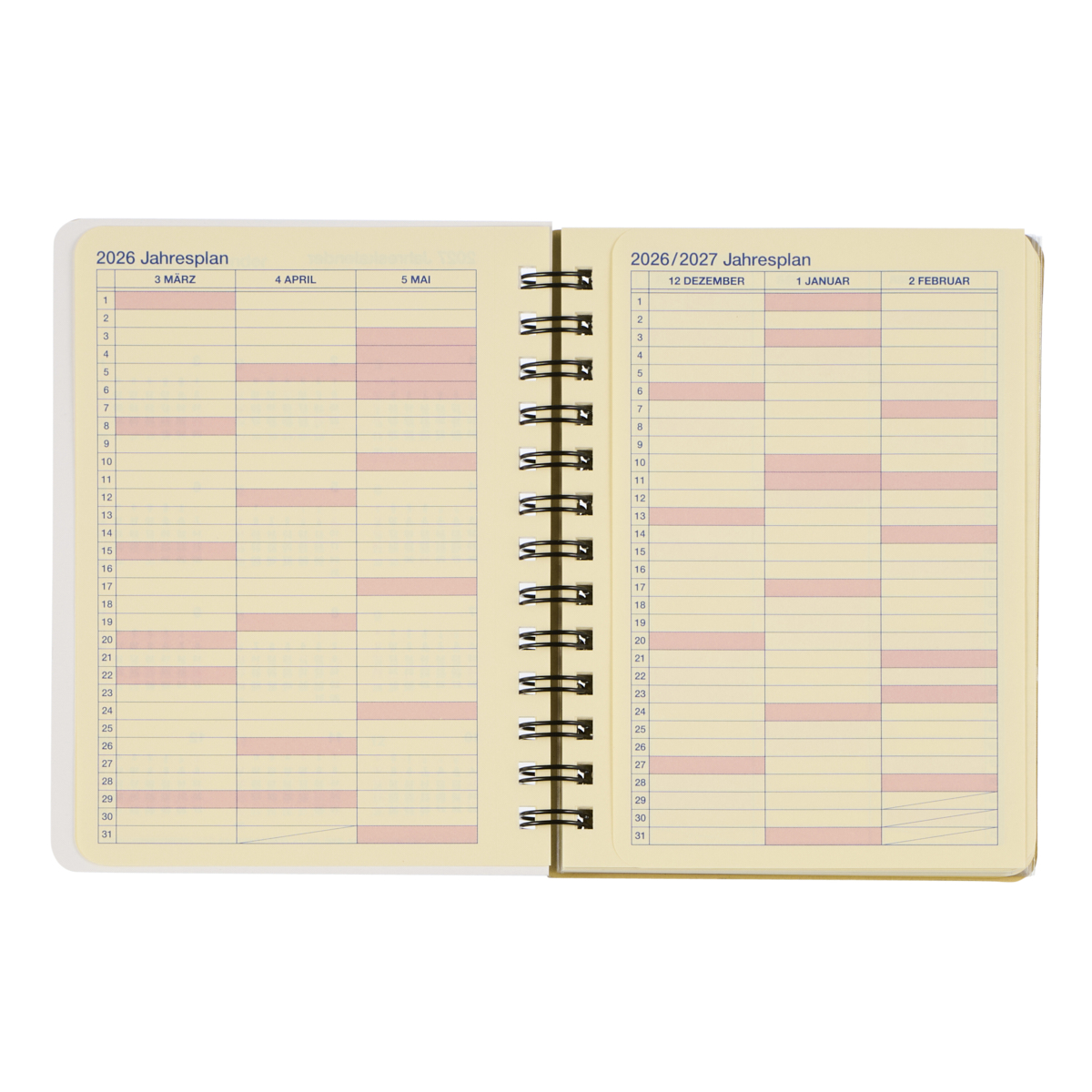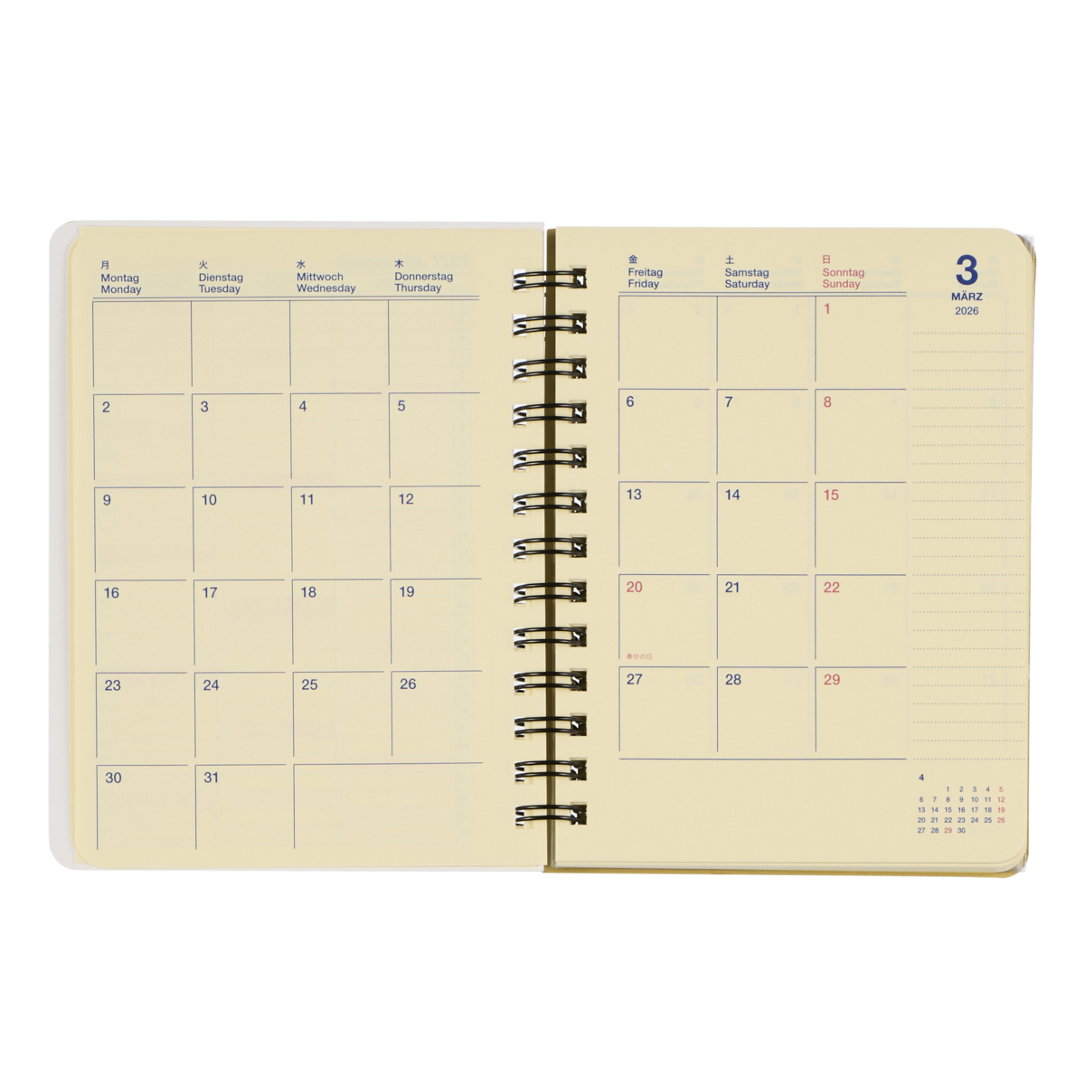 サイズは、コンパクトなメモダイアリーとして最適なMサイズ。中面は、見開きの月間カレンダーとメモページで構成された、シンプルなマンスリータイプです。表紙を開くと、中扉、イヤーカレンダー、イヤースケジュール、マンスリー、方眼メモページ、クリアポケットが続きます。5mm方眼のメモページは、書き込みの多い方にも嬉しい125ページ。インクのにじみと裏写りを抑えた、クリーム色の上質紙です。カードや付箋などを収納できる、便利なクリアポケットも5枚付いています。表紙には透明フィルム加工が施されているため、1年間しっかりと使えます。同デザインは、ほかに、リングタイプのL、A5、ホチキス綴じのノートタイプのB6、A5もあります。発想を刺激するユニークな1冊です。