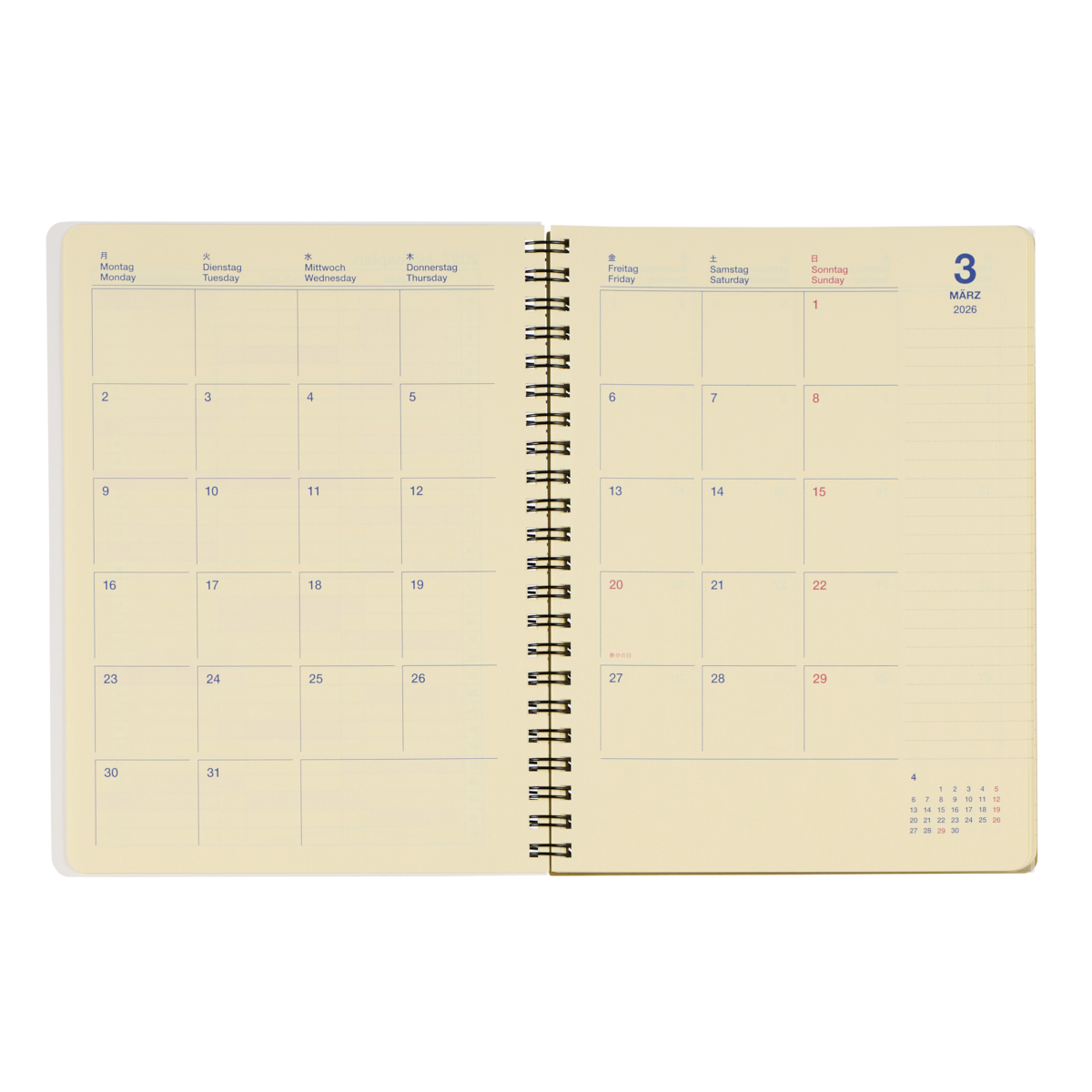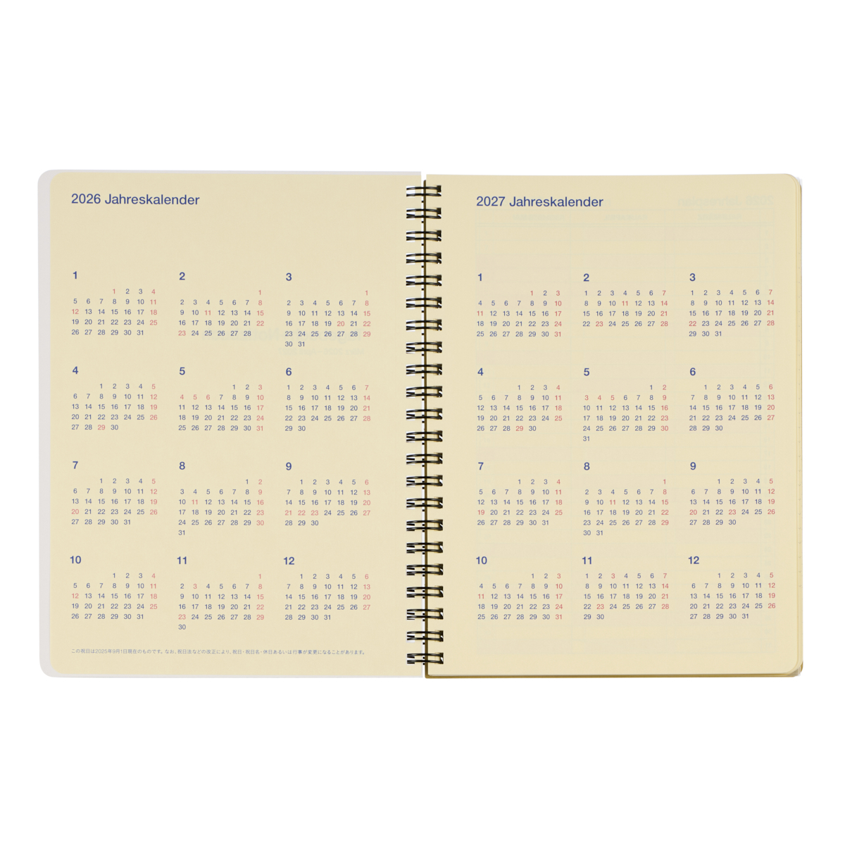 サイズは、やや大きめで書き込みスペースの広いA5サイズ。中面は、見開きの月間カレンダーとメモページで構成された、シンプルなマンスリータイプです。表紙を開くと、中扉、イヤーカレンダー、イヤースケジュール、マンスリー、方眼メモページ、クリアポケットが続きます。5mm方眼のメモページは、書き込みの多い方にも嬉しい165ページ。インクのにじみと裏写りを抑えた、クリーム色の上質紙です。カードや付箋などを収納できる、便利なクリアポケットも5枚付いています。表紙には透明フィルム加工が施されているため、1年間しっかりと使えます。同デザインは、ほかに、リングタイプのM、L、ホチキス綴じのノートタイプのB6、A5もあります。発想を刺激するユニークな1冊です。