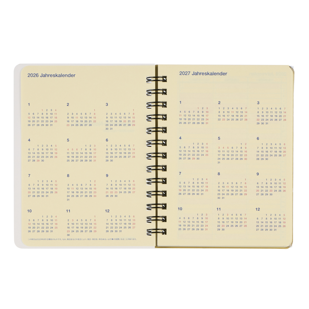 サイズはコンパクトなメモダイアリーとして最適なMサイズ。中面は、見開きの月間カレンダーとメモページで構成された、シンプルなマンスリータイプ。表紙を開くと、中扉、イヤーカレンダー、イヤースケジュール、マンスリー、方眼メモページ、クリアポケットが続きます。5mm方眼のメモページは、書き込みの多い方にも嬉しい125ページ。インクのにじみと裏写りを抑えた、クリーム色の上質紙です。カードや付箋などを収納できる、便利なクリアポケットも5枚付いています。同デザインは、ほかに、リングタイプのL、A5、ホチキス綴じのノートタイプのB6、A5もあります。花ののびやかさが心地よい1冊です。