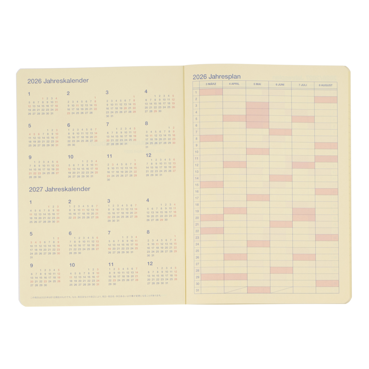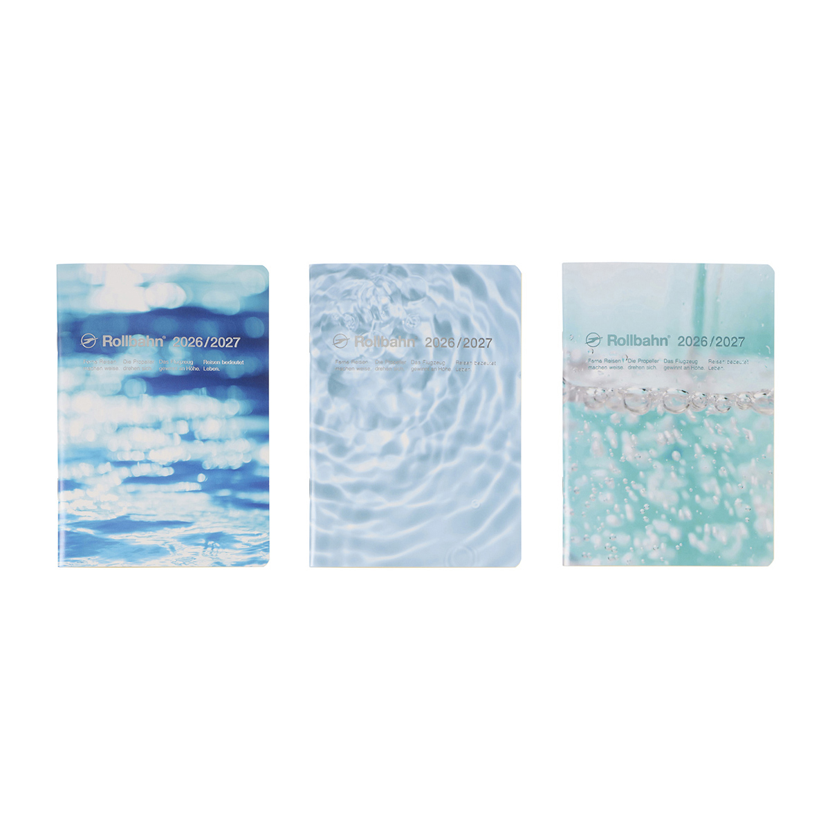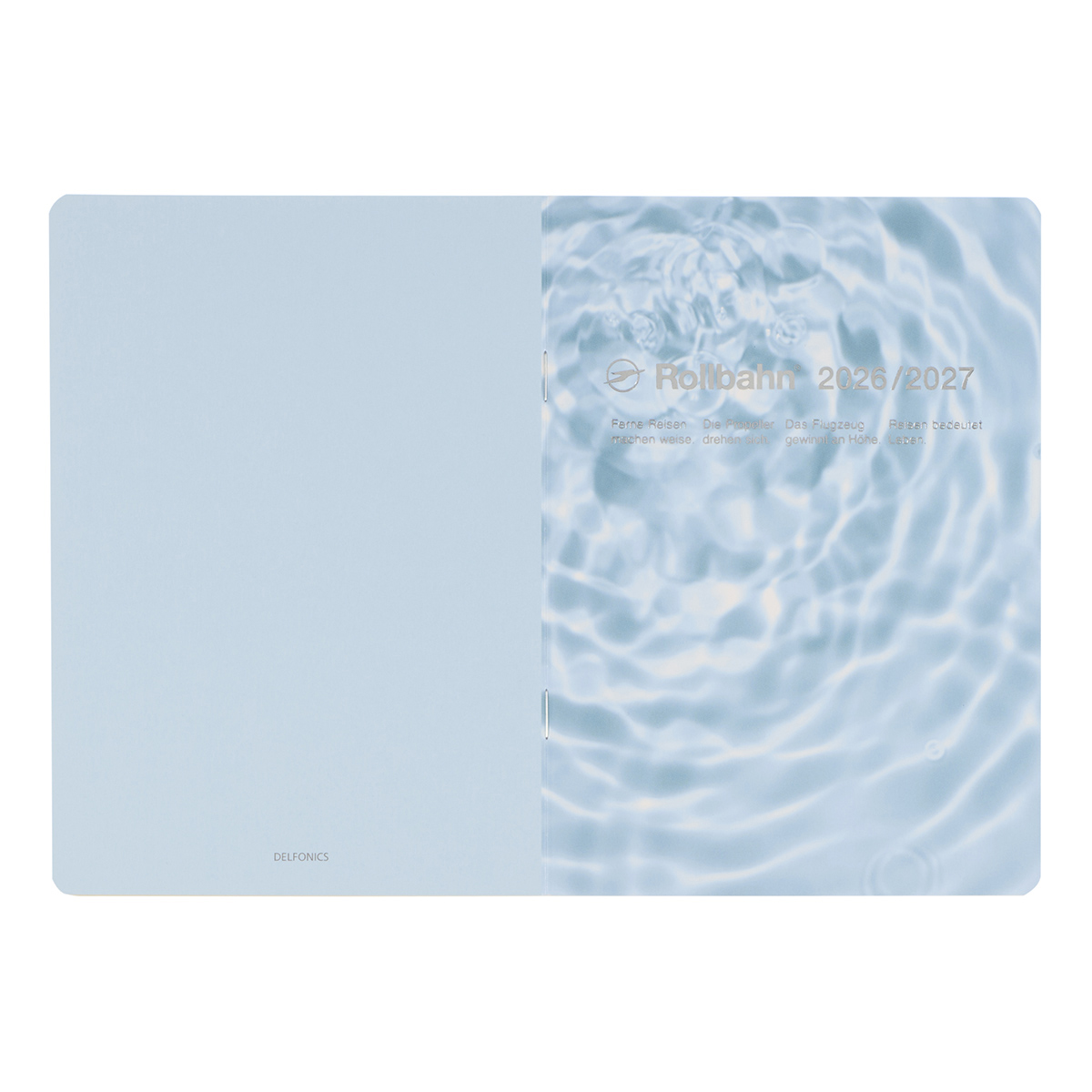 サイズはダイアリーで人気の高いB6。見開きの月間カレンダーで構成された、マンスリータイプ。表紙を開くとリングタイプと同様に、中扉、イヤーカレンダー、イヤースケジュール、マンスリー、方眼メモページが続きます。5mm方眼メモは29ページ。インクのにじみと裏写りを抑えた、クリーム色の上質紙です。スケジュールページを最小限にしつつ、シンプルに書き込みしやすいデザインで、使い勝手のよいダイアリーに仕上げました。同デザインは、ほかに、リングタイプのM、L、A5、ホチキス綴じのノートタイプのA5もあります。手に取るたびに、水のきらめきに目を奪われる1冊です。