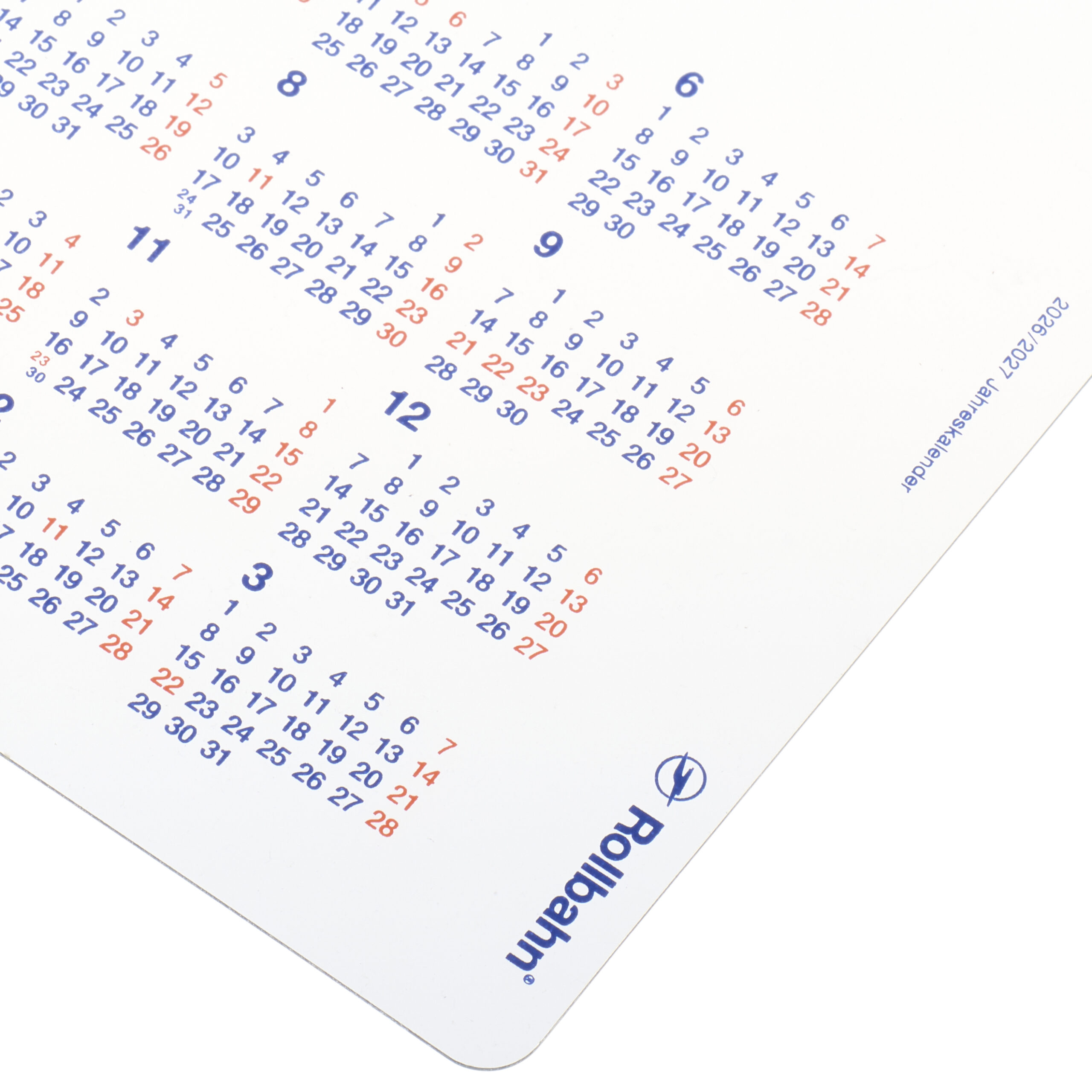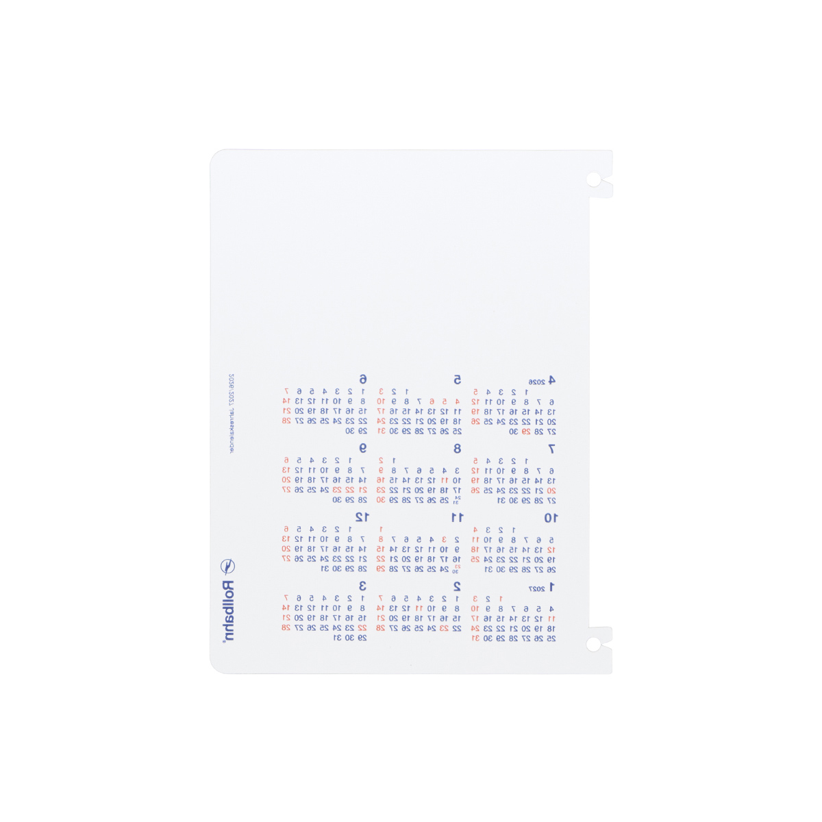 ホワイト、ダークブルーの全2色。表紙に取り付けて、日付を確認することができます。鮮やかなカラーや豊富な絵柄のロルバーンの表紙に合うように、ベーシックなカラーで仕上げました。マンスリーカレンダーの文字色は透けないため、濃い色やカラフルなデザインの表紙のロルバーンに合わせた際の視認性も高いことが特徴です。